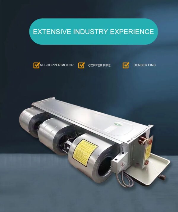 Excellent thinwall copper tube and efficient hydrophilic aluminum fin are under water pressure bonded treatment.Fan Coil Unit patent inverse crossing circuit to reach the best heat transfer efficiency. Brass water distributor is used for improving water flow distribution, in order to provide better heat transfer effect.
